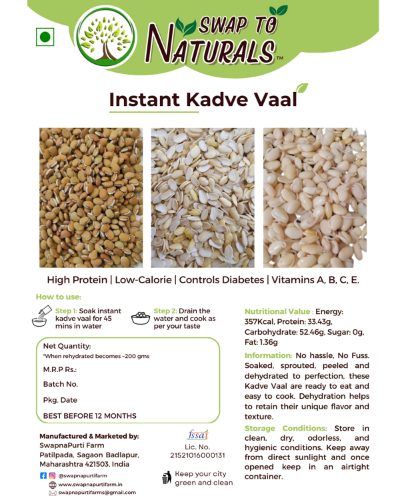 Kadve Vaal (Bitter field beans, slightly bitter in taste) are a part of the Maharashtrian staple diet. It is used to make sabzi, pulao, usal, bhirde etc. It is also called as Dalimbya. Swap To Natural Instant Kadve Vaal, are soaked, sprouted, peeled and then dehydrated for hassle-free cooking. Dehydrated bitter field beans retain their distinct flavour and can be rehydrated for use as per required quantity. Just soak for 45 mins. before preparing dishes. Instant Kadve vaal packet saves 3 days of effort of soaking, sprouting and peeling. These ready-to-use Kadve Vaal when rehydrated becomes more than 200gms. Store in cool dry place in an airtight container.